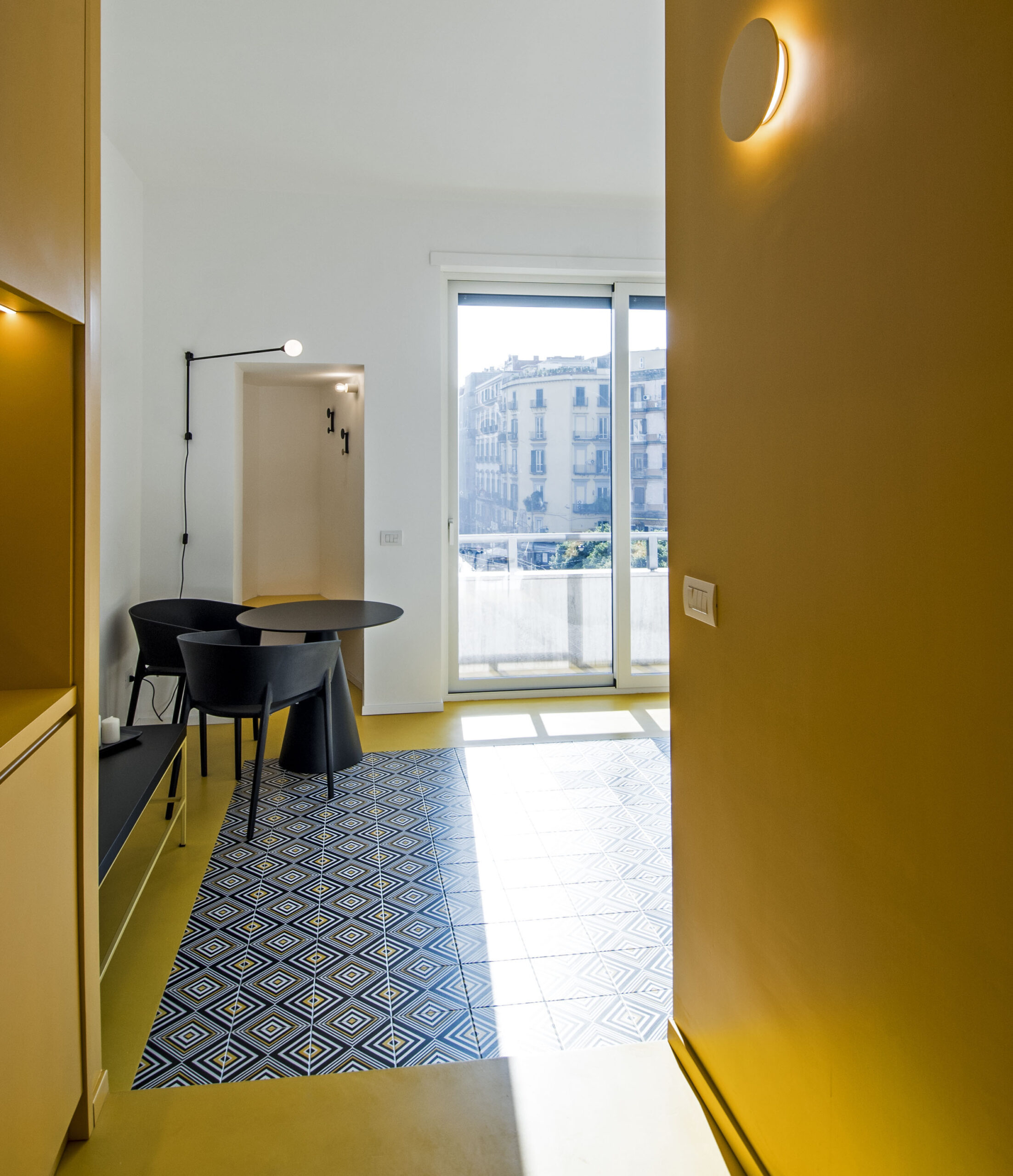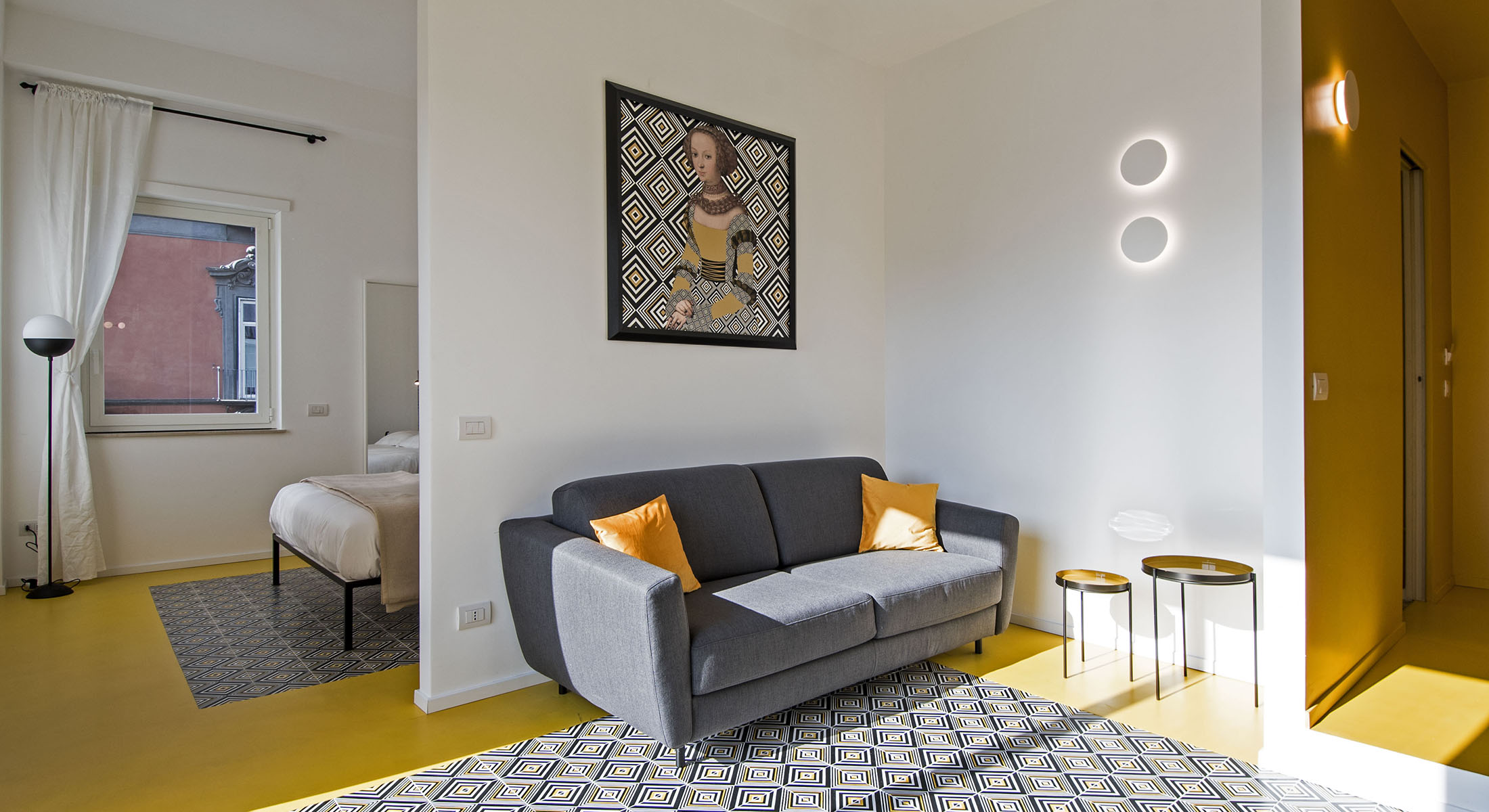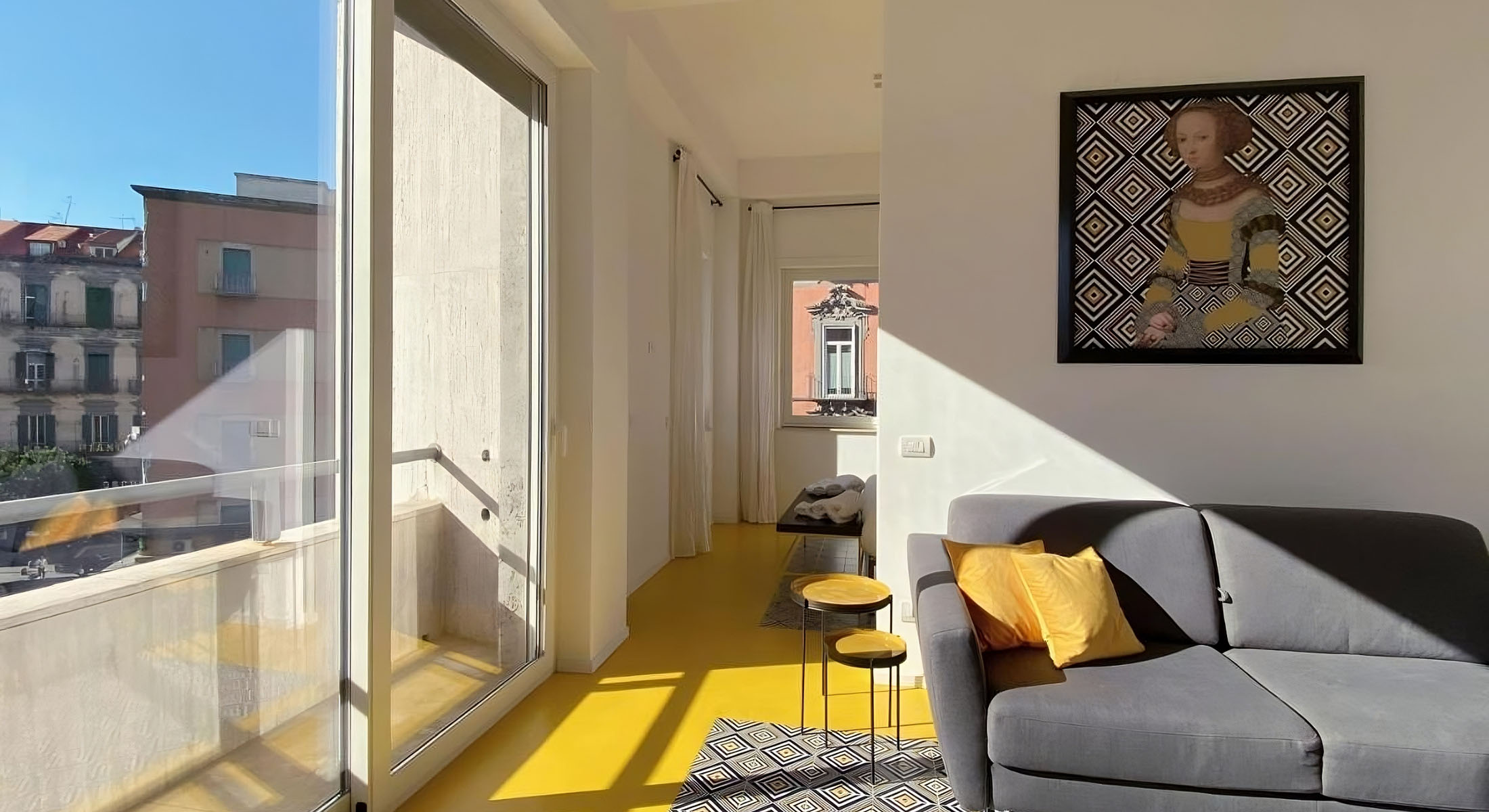 La camera, dominata dal colore giallo, trasmette luce, energia e vitalità, evocando la freschezza e la giovinezza di chi ama accogliere con gioia le novità. Un ambiente intimo e raffinato, ideale per un soggiorno confortevole nel cuore di Napoli.