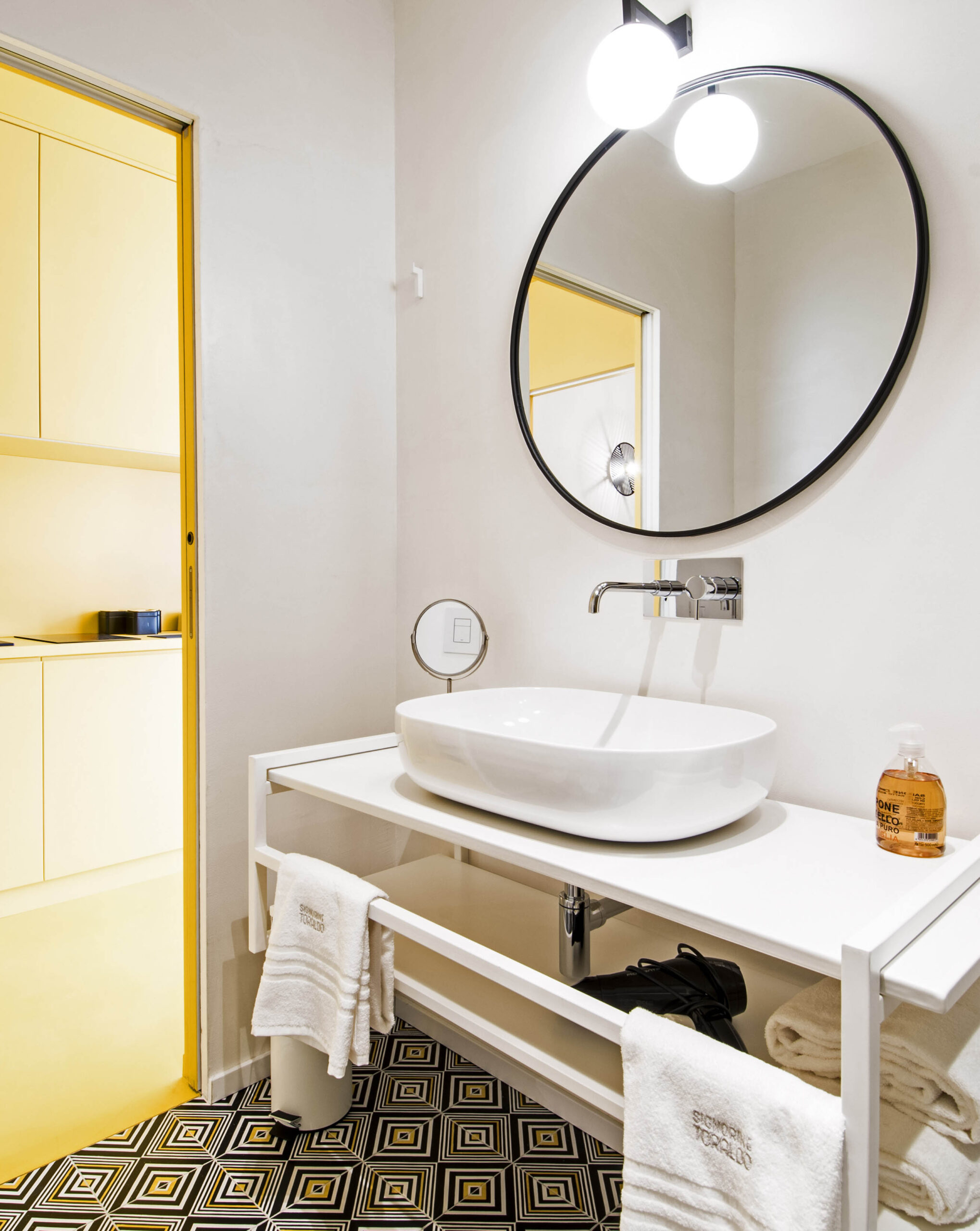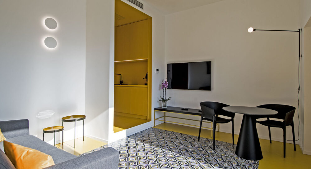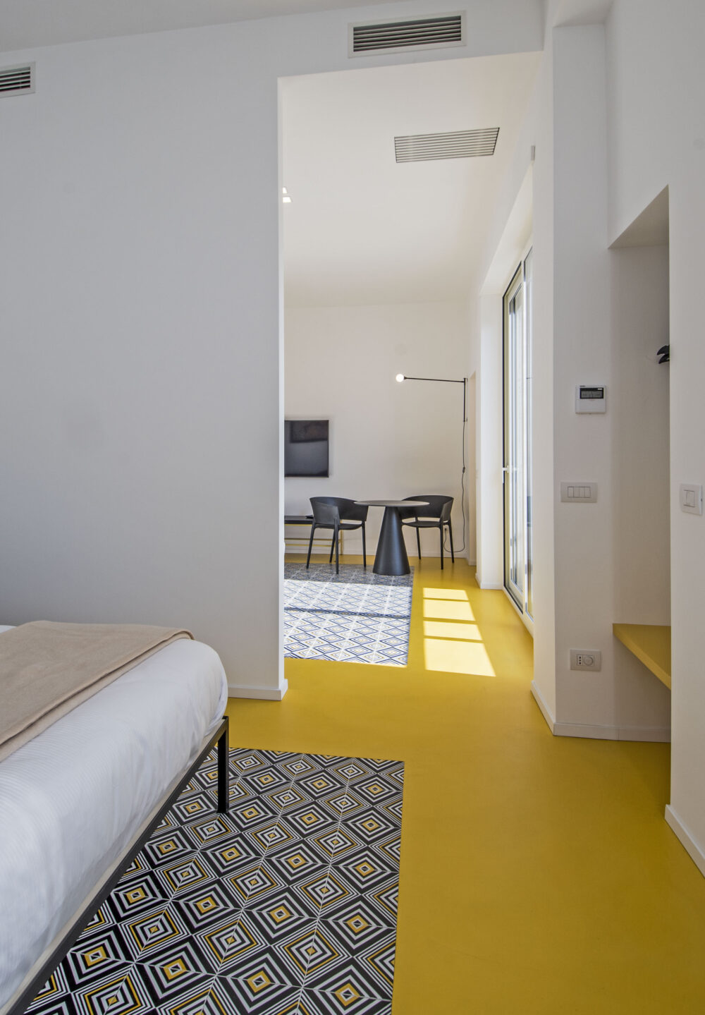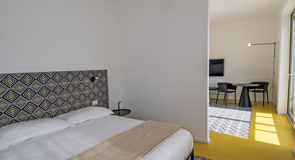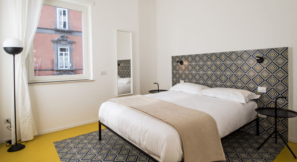 La camera, dominata dal colore giallo, trasmette luce, energia e vitalità, evocando la freschezza e la giovinezza di chi ama accogliere con gioia le novità. Un ambiente intimo e raffinato, ideale per un soggiorno confortevole nel cuore di Napoli.